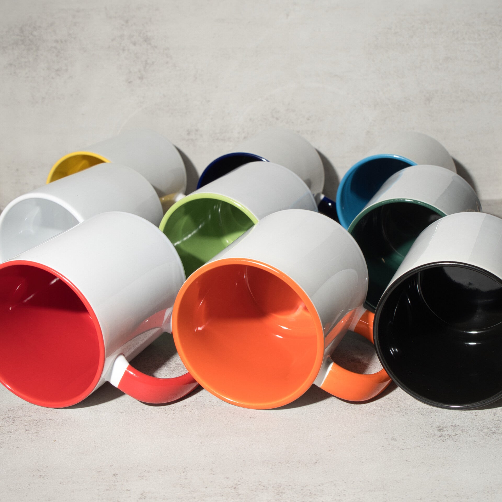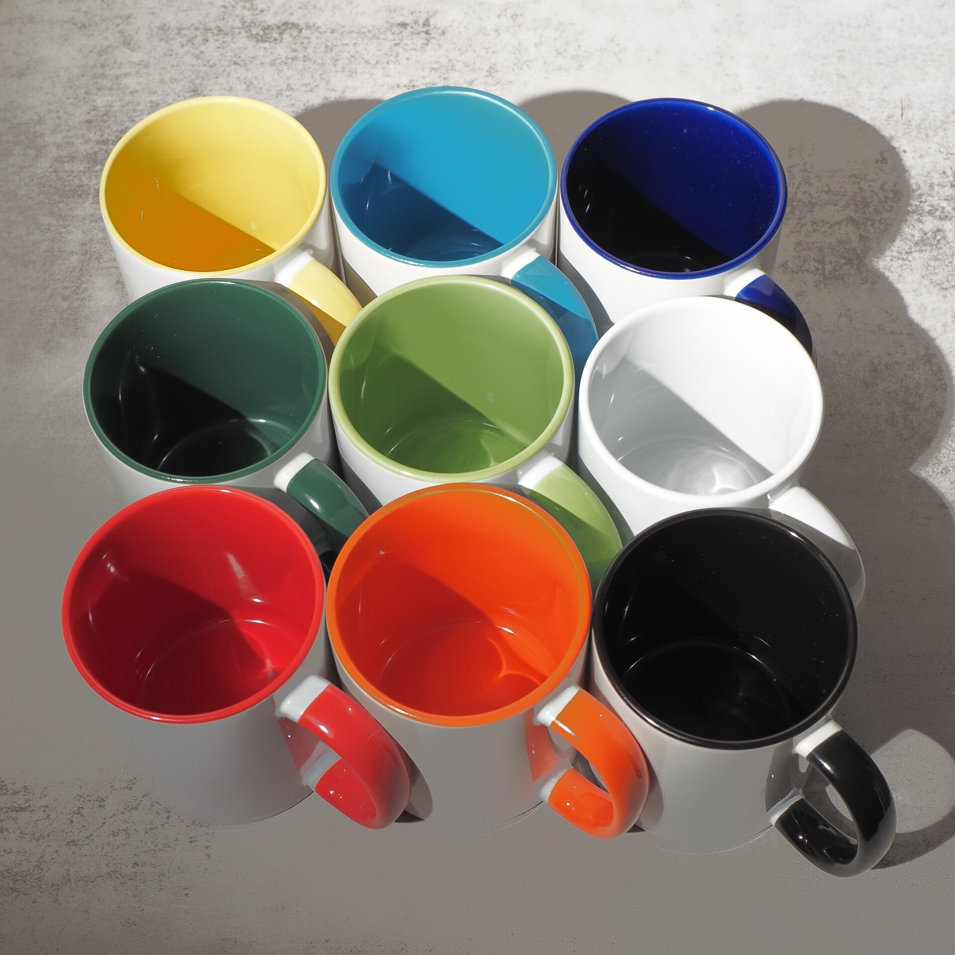 Weiße Keramiktasse mit farbiger Innenseite und Henkel.